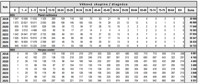 U pásového oparu naopak oproti předchozím letům počet nahlášených případů narostl o více než 50 %. V roce 2025 se jednalo o 8 551 případů, zatímco v předchozích letech o 3 768 (v roce 2024), 3 848 (v roce 2023) a 3 344 (v roce 2022).